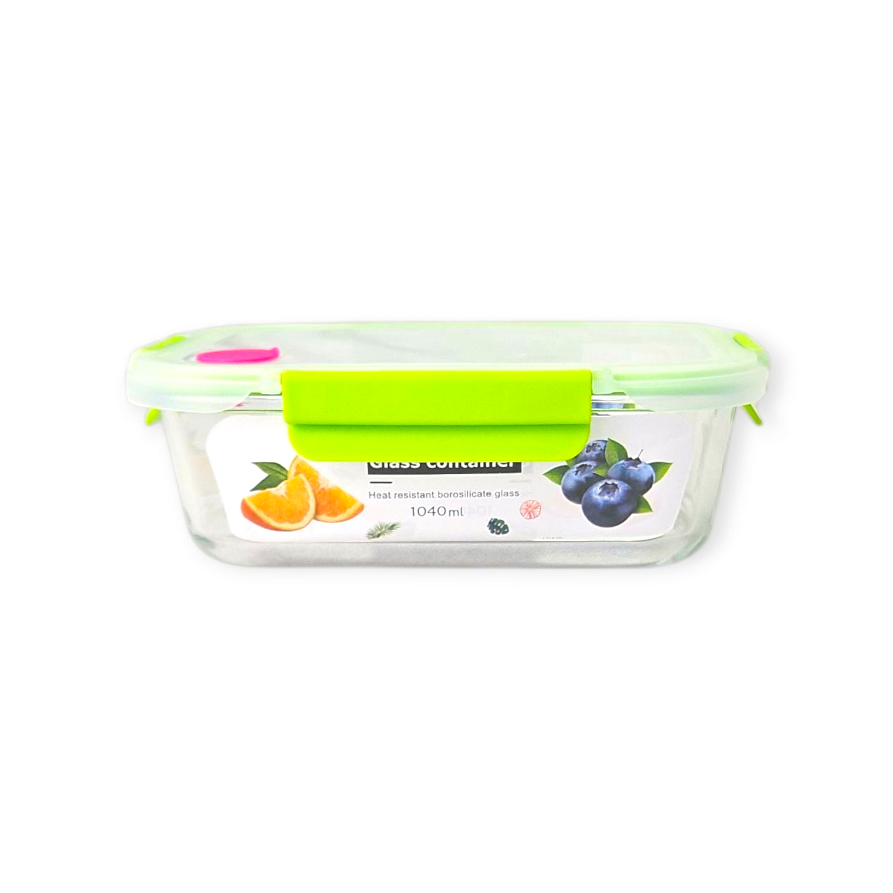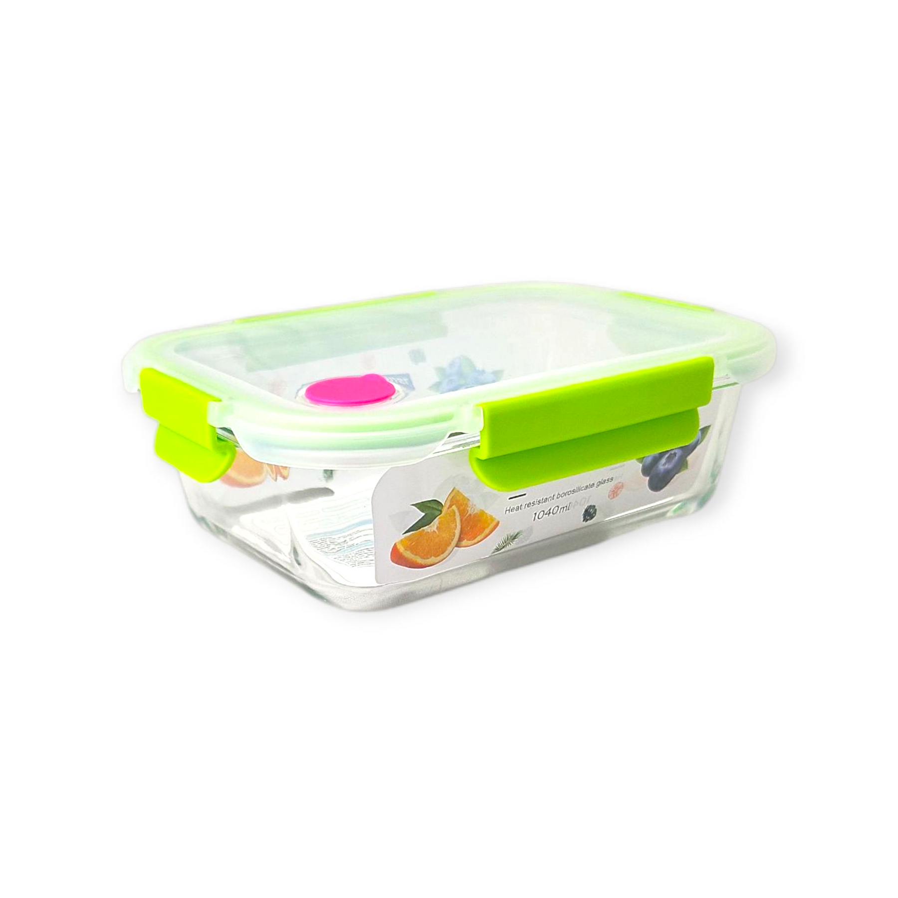 Size: 1040 ml (20 x 15 x 6.5 cm)Available With Green Lid Only. Features Heat Resistant Borosilicate Glass & Vent & Seal Clip Lid.